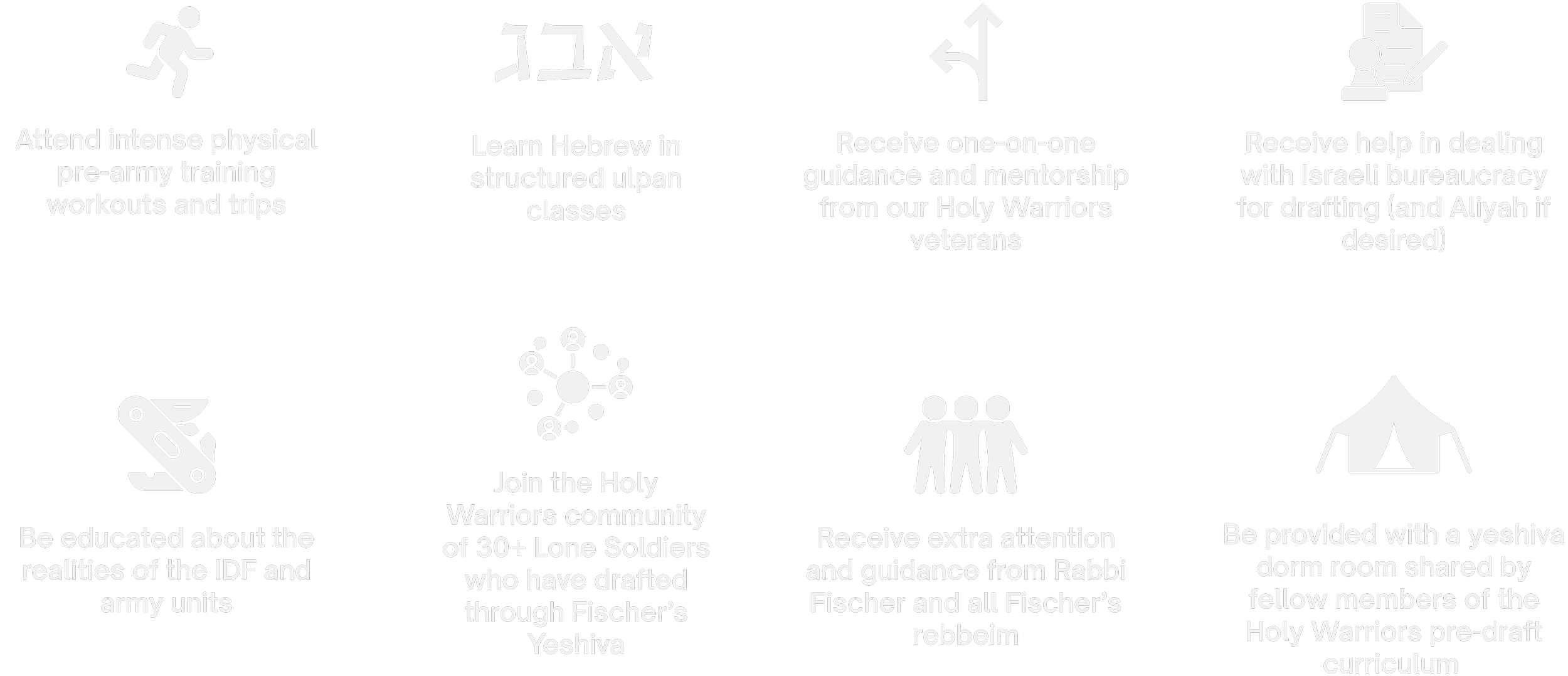 We have a community of over thirty Lone Soldiers who are alumni of Fischer’s Yeshiva. Our alumni have been in a variety of combat units, including religious units, special forces units, infantry units, and many have served in command roles in their units. Our program directors both served in special forces units and saw combat in Judea & Samaria, Gaza, Lebanon, Syria, and on October 7th. They both have extensive previous experience working in pre-draft IDF preparation programs, and know exactly how to help pre-draftees fulfill their goals of a successful and meaningful IDF service.